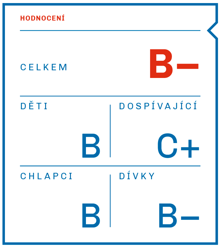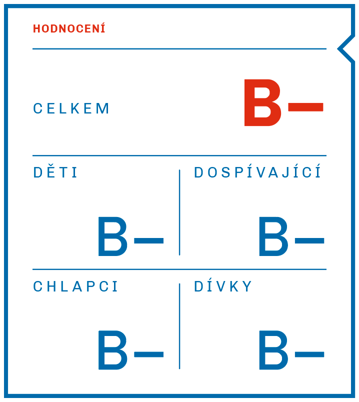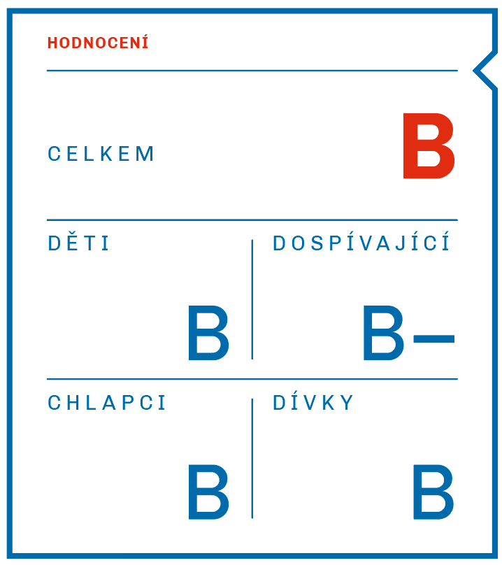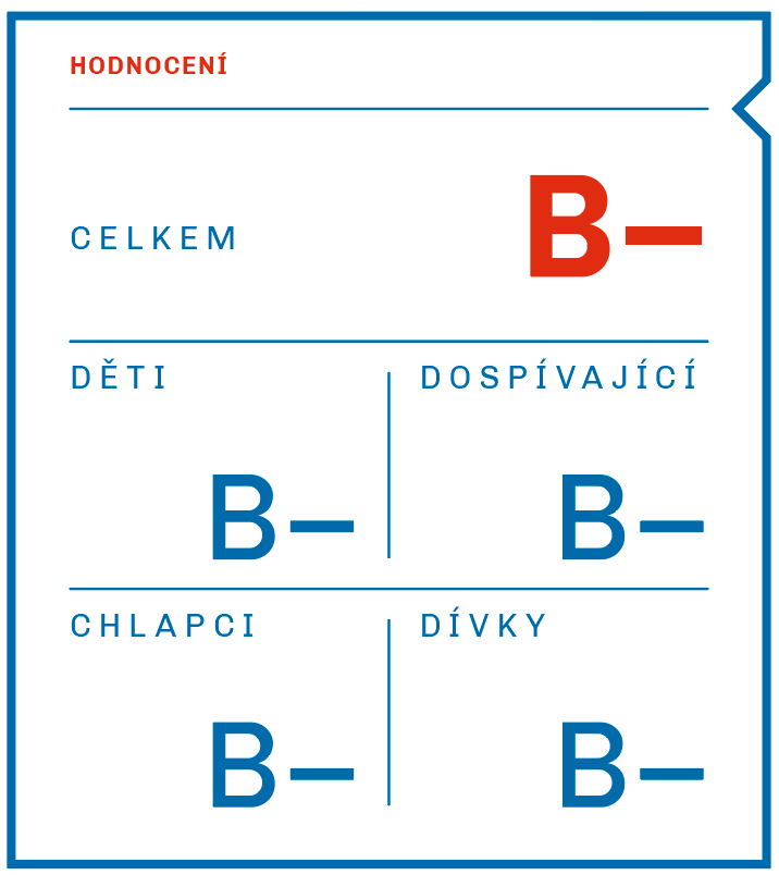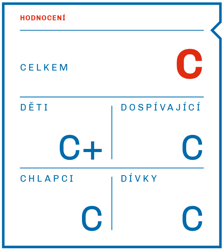 Celková známka byla indikátoru přidělena na základě výsledků tří průřezových studií o celkovém počtu 13 900 respondentů. Data o zapojení do organizované pohybové aktivity nebo sportu byla sbírána subjektivními metodami, tj. buď standardizovanými dotazníky nebo využitím záznamových archů. Ve sledovaném období se ve svém volném čase věnovalo organizované pohybové aktivitě nebo sportu 66 % dětí a dospívajících. Chlapci sportují v rámci sportovních klubů či organizací ve vyšší míře než dívky. Za zmínku rovněž stojí rozdíl mezi sledovanými věkovými kategoriemi, kdy je patrný významně vyšší podíl dětí zapojených do organizované pohybové aktivity a sportu oproti dospívajícím. Ve srovnání s předchozí verzí národní zprávy se situace nezměnila a celková známka zůstává stejná.