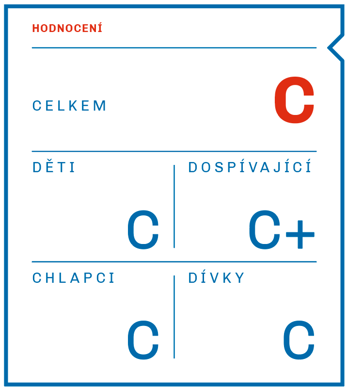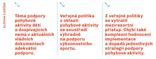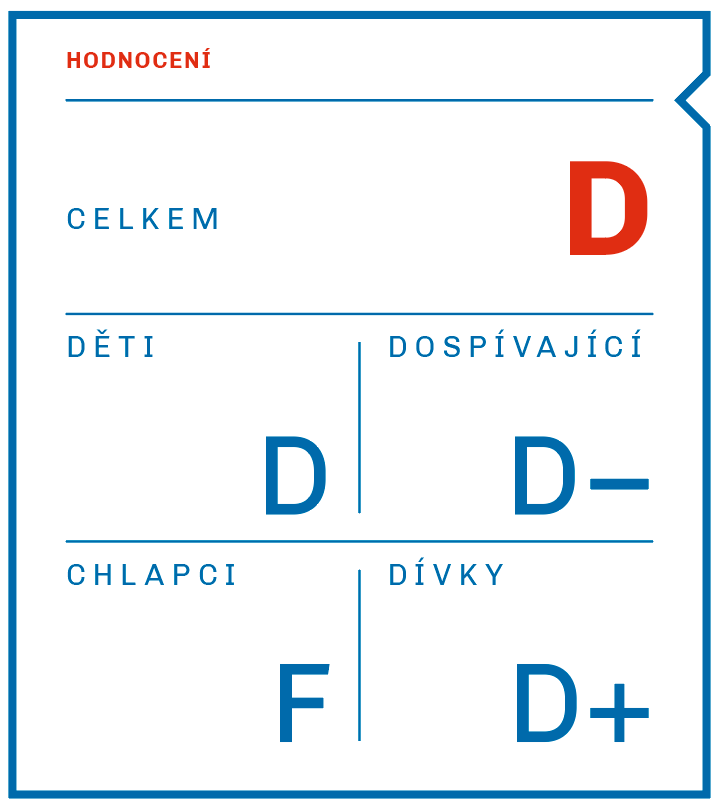 Posouzení stavu veřejné politiky v oblasti podpory pohybové aktivity dětí a dospívajících se zakládá na obsahové analýze strategických dokumentů Ministerstva školství, mládeže a tělovýchovy, Ministerstva zdravotnictví, Národní sportovní agentury a Ministerstva dopravy. V uplynulém období agenda podpory pohybové aktivity obyvatel České republiky ze strategických a koncepčních dokumentů napříč jednotlivými resorty vymizela. Zároveň došlo k omezení této problematiky pouze na oblast výkonnostního sportu bez uplatňování meziresortního přístupu k podpoře pohybu dětí. Na úrovni nově založené Národní sportovní agentury docházelo k novému nastavení priorit se zaměřením na rozvoj sportovního prostředí. Ve sledovaném období tvořilo podstatnou část opatření vymezování legislativního rámce pro nově vzniklou agenturu a nastavování pravidel fungování v oblasti dotační politiky. Ve strategickém dokumentu Ministerstva zdravotnictví „Zdraví 2030“ byla zcela opomenuta problematika podpory pohybu dětí. Nová strategie tak nenavazuje na předchozí, z pohledu podpory pohybové aktivity, komplexně zpracovaný dokument „Zdraví 2020“ a příslušný akční plán, který význam pohybu a jeho podpory akcentoval. Na nedostatečnou úroveň pohybové aktivity dětí a dospívajících nereaguje ani Ministerstvo školství, mládeže a tělovýchovy, které tuto oblast ve své „Strategii vzdělávací politiky 2030+“ rovněž nezmiňuje. Národní strategie rozvoje cyklistické dopravy Ministerstva dopravy byla v době hodnocení již na konci své platnosti bez dostatečně zajištěné implementační a evaluační fáze. Návazný dokument v podobě „Koncepce městské a aktivní mobility 2021–2030“ byl schválen až v roce 2021, tj. mimo období hodnocené v této zprávě. Implementace a evaluace dopadů jednotlivých strategií je problémem také ve všech ostatních resortech, jejichž gesce se tematika podpory pohybové aktivity dotýká (např. Ministerstvo práce a sociálních věcí, Ministerstvo pro místní rozvoj). Při srovnání s předchozím sledovaným obdobím lze u dvou ze tří hodnoticích kritérií sledovat podstatné zhoršení, což bylo příčinou snížení hodnocení tohoto indikátoru z C+ na D+.