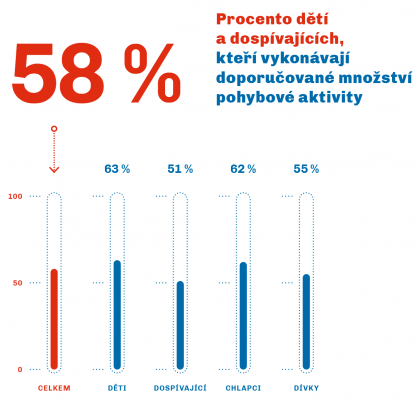 58 % dětí a dospívajících vykonává doporučené množství středně až vysoce zatěžující pohybové aktivity.