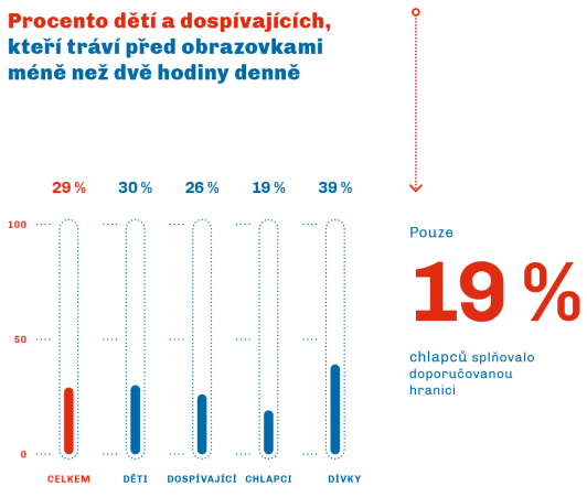 29 % dětí a dospívajících tráví ve svém volném čase před obrazovkami méně než dvě hodiny za den.