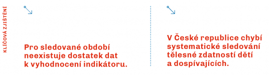 Z důvodu nedostatečného množství dat nebylo možné indikátor spolehlivě zhodnotit. Ve sledovaném období proběhlo pouze jedno průřezové šetření posuzující úroveň tělesné zdatnosti u nereprezentativního vzorku dětí a dospívajících, jež poskytlo data od 254 dětí z hlavního města Prahy. S ohledem na hlavní zaměření studie byly ze souboru vyřazeny děti s akcelerovanou biologickou zralostí a běžně sportující děti. Tělesná zdatnost byla posuzována pomocí testové sestavy UNIFITTEST (6–60). Při srovnání s mezinárodními standardy dosahovala úroveň aerobní zdatnosti dětí mírně podprůměrné úrovně (42. percentil), přičemž české dívky za průměrnými hodnotami zaostávaly méně než chlapci. Kromě zmiňované studie se v České republice ve sledovaném období uskutečnil výzkum zaměřený na tělesnou zdatnost dětí z Plzeňského kraje. Výsledky tohoto šetření však nemohly být využity z důvodu použitých motorických testů (Deutscher Motorik-Test 6–18), které neumožňovaly porovnání s mezinárodními normativně vztaženými standardy. Srovnání s předchozím sledovaným obdobím, ve kterém bylo na základě analýzy šesti studií s celkovým počtem více než 12 000 účastníků z různých regionů České republiky uděleno hodnocení C+, tedy není možné. Tento výsledek odráží absenci systematického monitorování tělesné zdatností českých dětí a dospívajících.