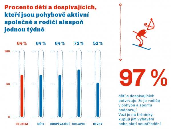 66 % dětí a dospívajících je pohybově aktivní společně s rodiči alespoň jednou týdně nebo jsou rodiči k pohybu podporováni.
