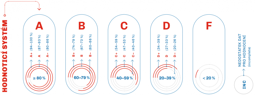 Pro každý indikátor byl vypočten vážený průměr zohledňující velikost studie. Pomocí standardizované klasifikační stupnice bylo indikátorům přiděleno hodnocení (známka) na škále A–F. Pokud to bylo možné, bylo hodnocení stanoveno zvlášť pro věkové a pohlavní kategorie. Analýza se zaměřila také na posouzení metodologických aspektů jednotlivých informačních zdrojů, které umožnilo stanovit míru kvality vstupních dat.